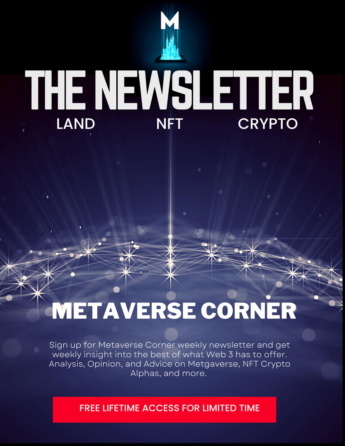 Metaverse Corner Newsletter is a weekly newsletter that offers weekly insight into best of the Web 3. Metaverse Land, NFT, Crypto, Education and more. Sign up for free lifetime subscription, offered only for limited time.